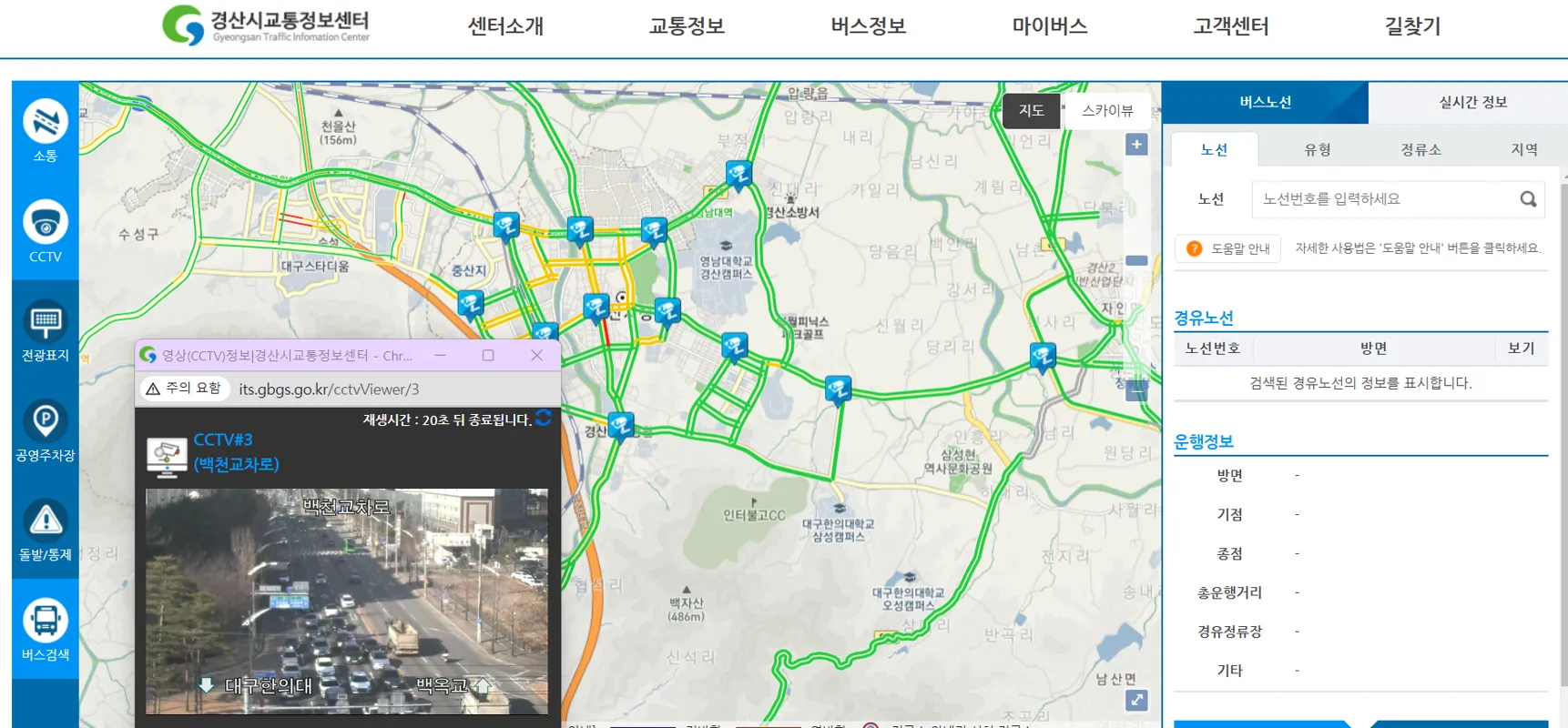 경산시 교통정보센터에서는 경산시의 교통 소통 정보, CCTV 영상, 도로 전광표지(VMS), 주차 정보 및 버스 정보를 제공합니다.