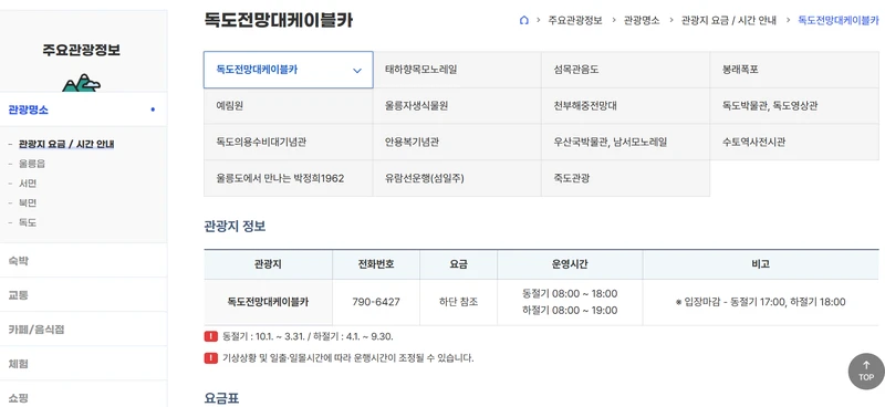 울릉도 독도의 주요관광지 요금부터 운영시간, 숙박, 교통에 이르기까지 여행에 필요한 모든 정보가 담겨있습니다.