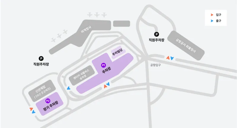 제주국제공항 주차장은 여객터미널 P1주차장, P2장기주차장, 화물터미널주차장, 직원/월정주차장이 있으며, 총 4,000여대의 차량을 동시에 주차할 수 있는 넓은 주차공간이 마련되어 있습니다. 주차장 혼잡도도 표시됩니다.
