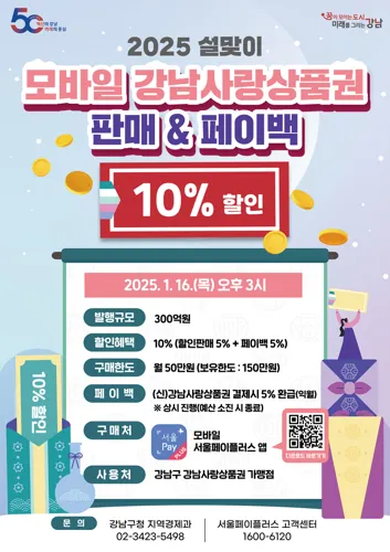 서울 강남구는 민생 경제 회복과 지역 경제 활성화를 위해 2025년 1월 16일 오후 3시부터 300억 원 규모의 "강남사랑상품권"을 발행합니다.